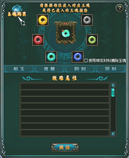 ”按钮可以打开玉魂商店,花费金钱购买6种玉魂分别对应微雕界面的6个镶嵌孔位。