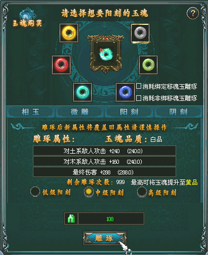 3. 玉魂分为白、蓝、绿、黄四种品质,雕琢洗练时有几率提升玉魂品质,