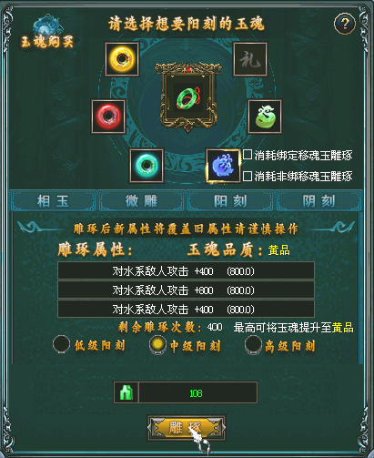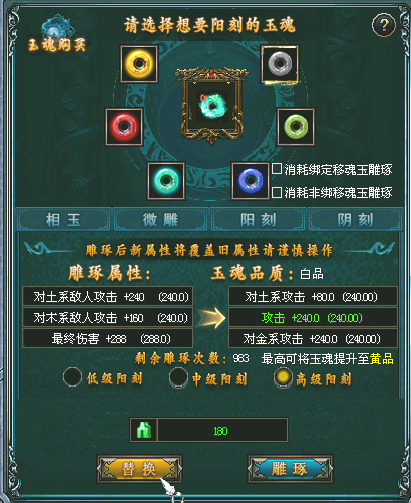 2. 每个玉魂最大雕琢洗练次数为1000次,洗练次数耗尽后属性固定。