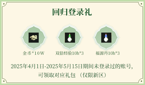 自2025.4.1----2025.5.15未登录的回归玩家还可领取任务专属好礼(属于回归账号)