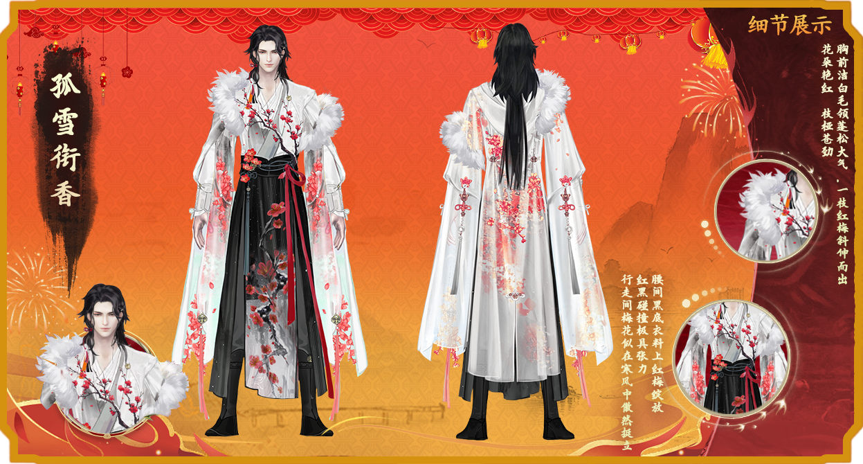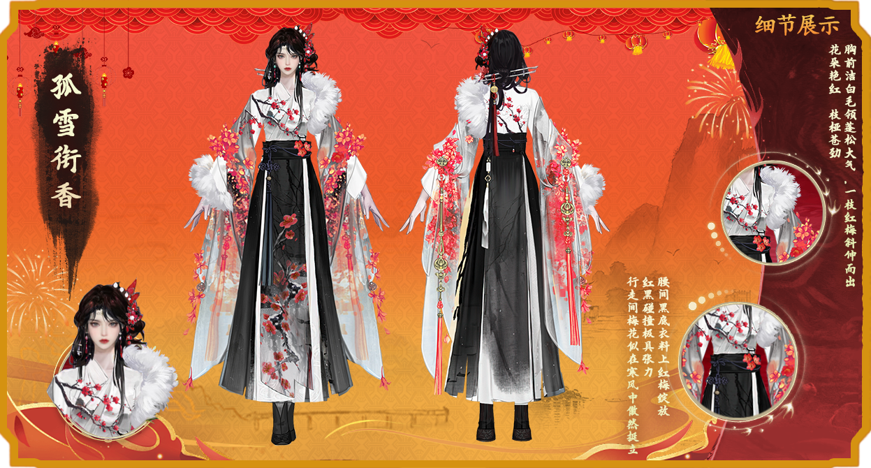 孤雪覆肩,寒梅衔香。这款时装以"雪月寒梅"为魂,将冬日孤高的诗意融入飘逸国风形制之中。蓬松白裘似落雪凝于肩颈,红梅纹样如暗香凝于衣袂,行走间衣袂翻飞,仿佛孤雪寒梅相伴而行,清冷中暗含暖意,尽显孤高雅致的江湖气质。